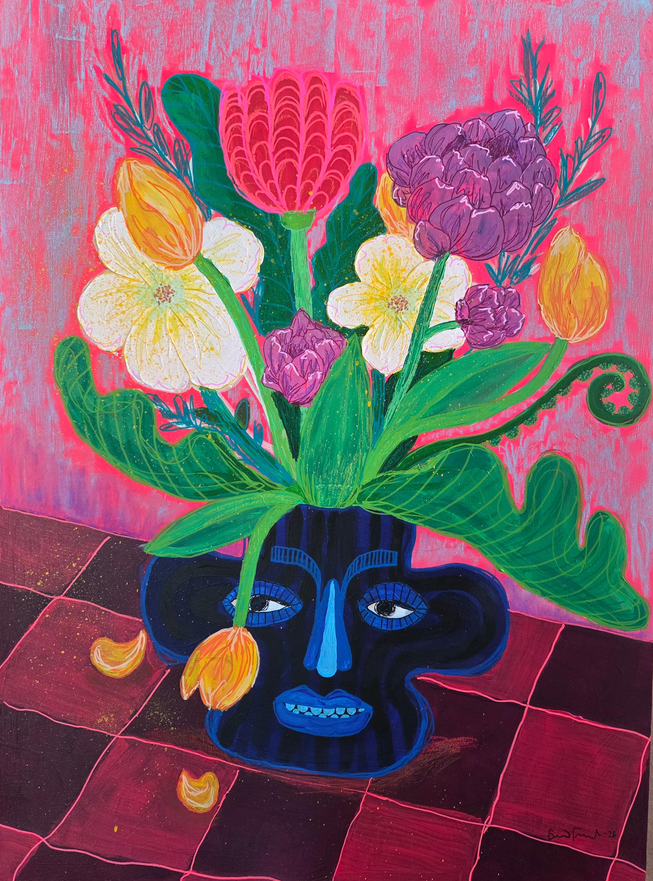 I påsk visar hon blomstrande illustrationer i tusch och akryl och abstrakta verk där färg möter trä tillsammans med bonader i textil och en och annan broderad brosch.