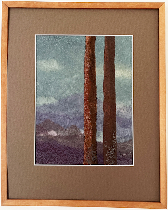 I ATELJÉN: Till mina textila bilder använder jag ett slags fritt ”symaskinsmåleri” – där jag med stoppsöm på dubbel bomullsväv, gärna delar av gamla lakan, syr fast tunn chiffong i skiftande färger och nyanser med många olikfärgade trådar. Skiftningar och färgstyrka varieras med antalet lager och i vilken ordning jag lägger chiffongen. Struktur och relief skapas på ett spännande sätt. Jag kallar det för ”textil konst med tråd och chiffong”.