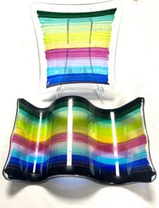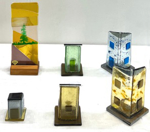 GLAS: Jag använder Bulls-Eye konstglas från Portland, USA, ett exklusivt handvalsat konstglas som finns i ett par hundra olika färger och utföranden som harmonierar med varandra. Jag gör glasföremål i egen design såsom fat, skålar, klockor, mobiler, fönster- och väggdekorationer, stand up, bord, trädgårdskonst. Löv och trädstammar är några återkommande teman, men hela tiden utvecklar jag nya serier med unika glasföremål.
