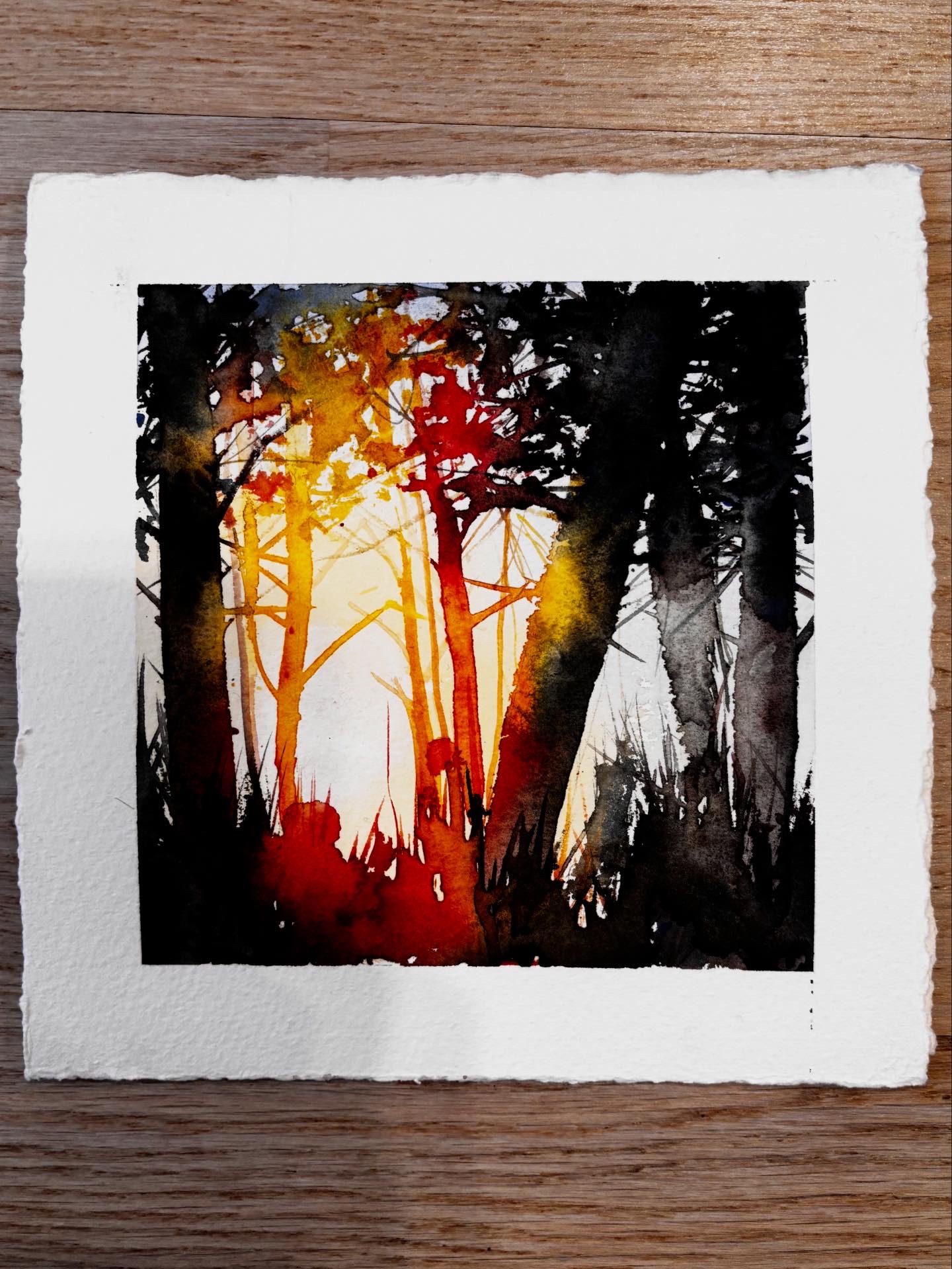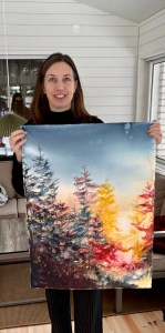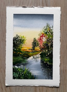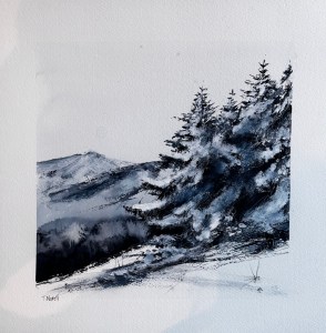 Jag målar ofta landskapsmotiv i akvarell och gärna med inslag av tusch. Mina målningar börjar jag ofta med genom att ösa på med färg och skvätta vatten. Ibland gör jag en skiss innan men jag gillar när målningen väljer sin egen riktning och uttryck. Jag tröttnar lätt på att måla detaljer och gillar mer att fokusera på formen och kontrasterna. Jag gillar även att variera pensel med att måla med kontokort för att få andra effekter.